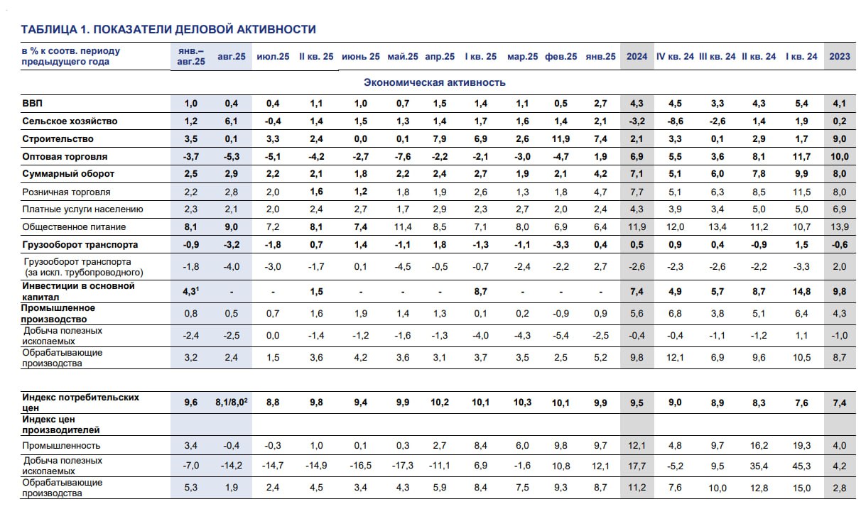 Минэкономразвития оценивает рост ВВП на 0.4% г/г в августе после 0.4% г/г в июле, тогда как в 1кв25 +1.4% г/г, в 2кв25 +1.1% г/г, а за 8м25 рост составил 1% г/г, в значительной степени сформированный в сен-дек.24, тогда как по расчетам Росстата в 1П25 ВВП в минусе на 0.2% к 4кв24, а в июле-августе динамика не улучшилась.