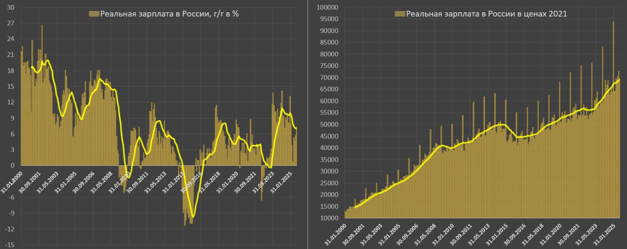 Зарплаты россиян в июле. Средняя начисленная зарплата до выплаты налогов в июле (статистика отстает на месяц) составила 99.3 тыс, что на 16.8% выше июл.24, за 7м25 – 96.5 тыс, +15.3% г/г, +37.4% к 7м23 и +76.5% к 7м21 и...