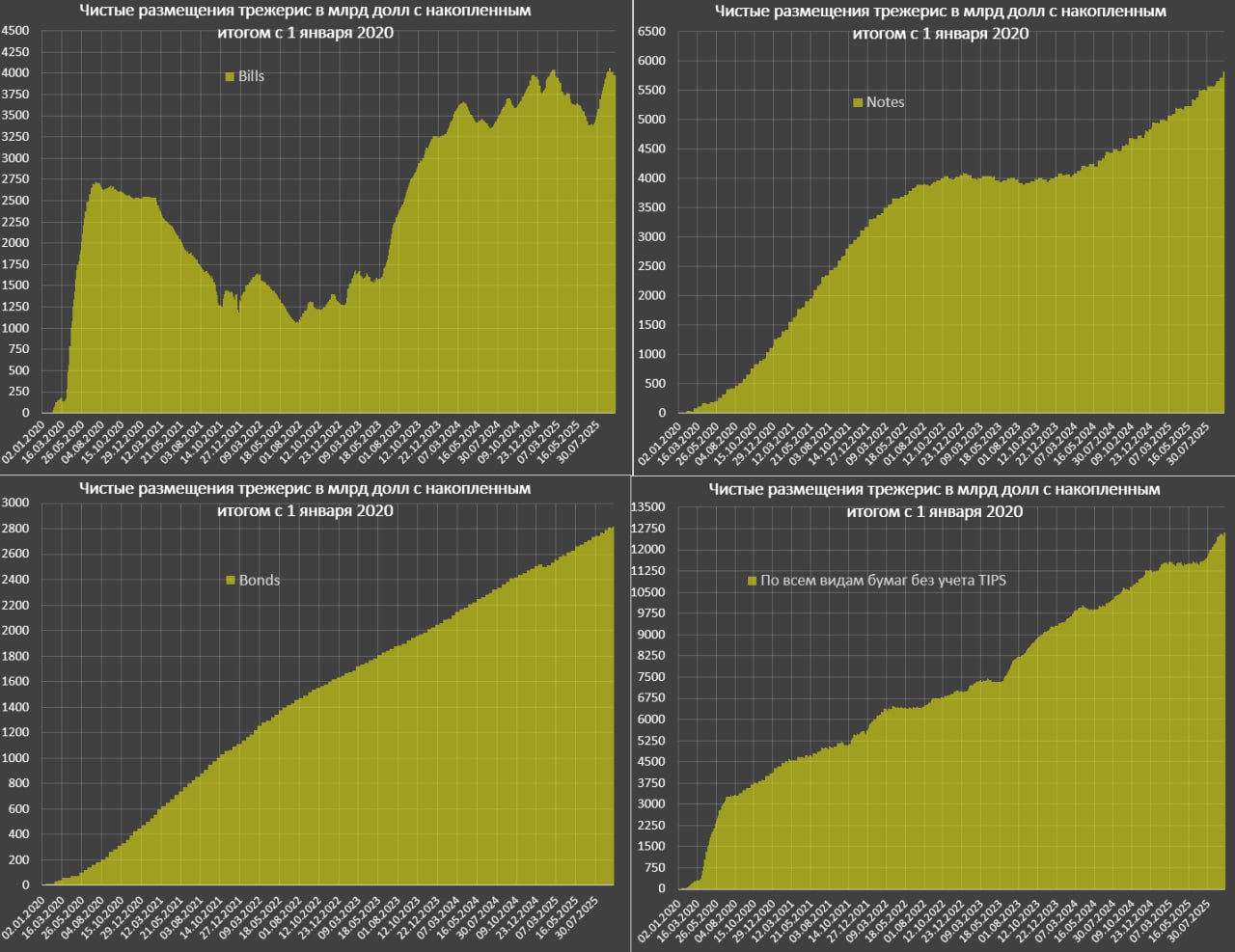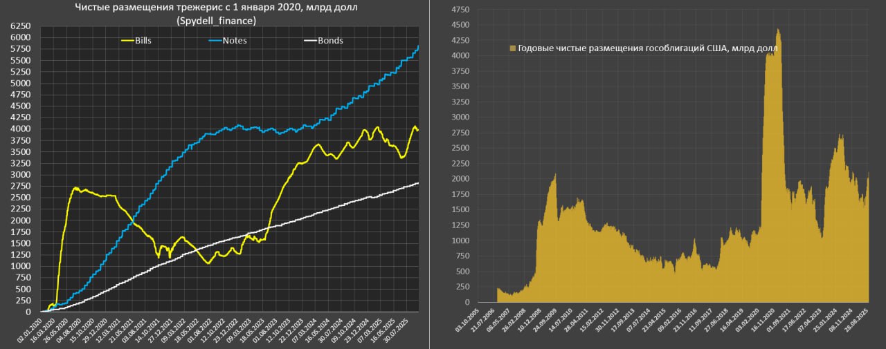 В среднем Казначейство сжирает с рынка 2-2.2 трлн в год и до исчерпания запасов избыточной ликвидности в обратном РЕПО с ФРС, использовали канал наиболее быстрых займов – в векселях.