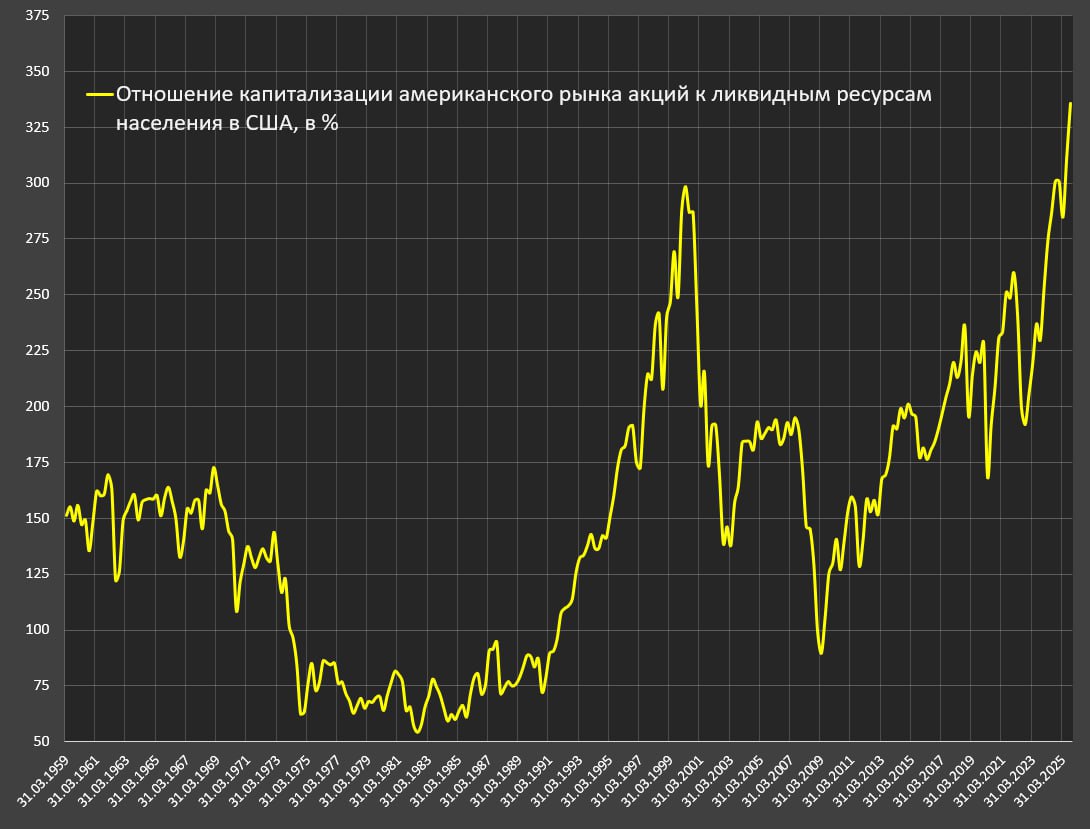 Отношение капитализации рынка к ликвидным ресурсам населения достигло 335% в начале октября 2025 vs 260% на пике пузыря в 4кв21, 215% в 2017-2019, 185% в 2011-2019, 182% в 2003-2007 и лишь 298% на пике пузыря доткомов в начале 2000.