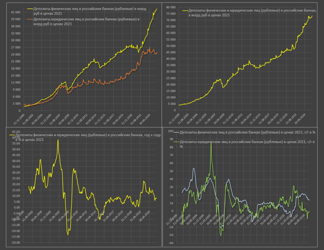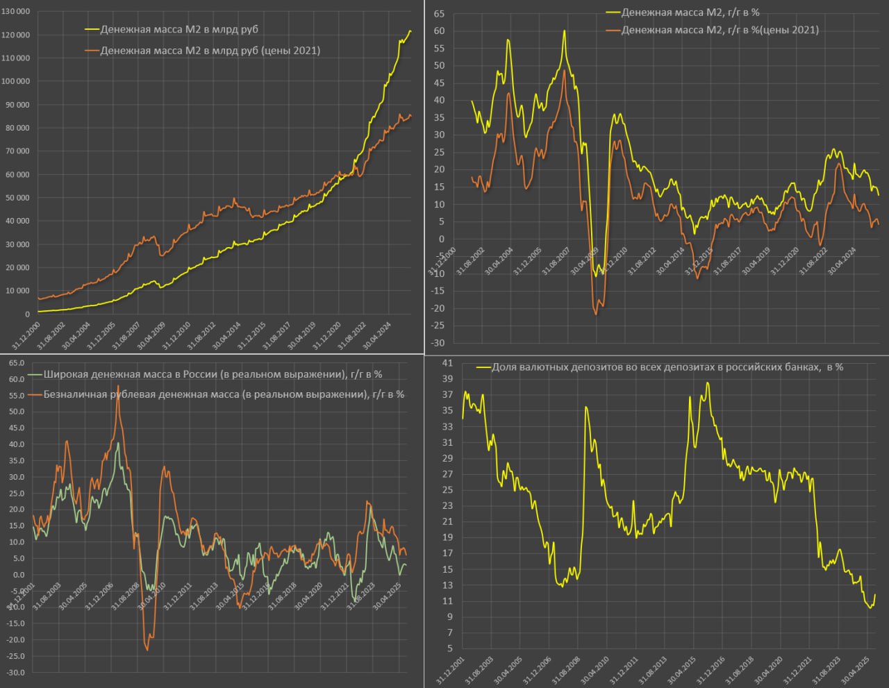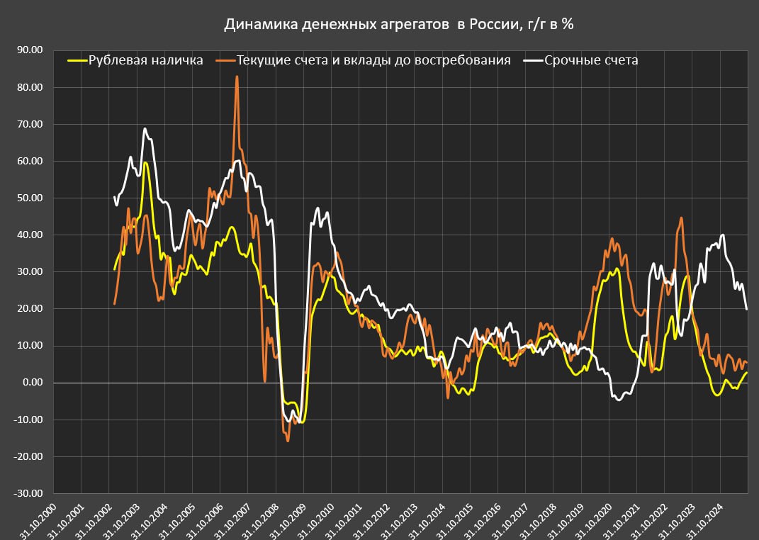 В реальном выражении условно дезинфляционная норма составляет 7% среднегодового прироста в 2017-2019 и почти столько же (6.8%) в 2017-2021. С 2022 по 2024 среднегодовые темпы роста М2 в реальном выражении выросли до 10.7% и 10.2% в 2023-2024, а в моменте темпы роста превышали 20% в середине 2023.