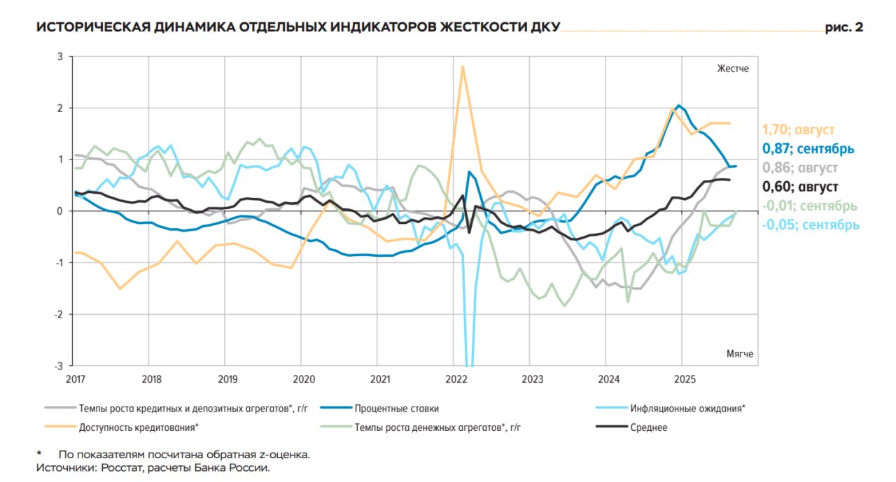 Интегральный показатель жесткости ДКУ (черная линия на графике) практически не меняется с весны, оставаясь самым жестким, как минимум за 10 лет, т.к. снижение рыночных ставок компенсируется снижением темпов кредитных/денежных агрегатов и инфляционных ожиданий при все еще очень жестких условиях доступности кредитования.