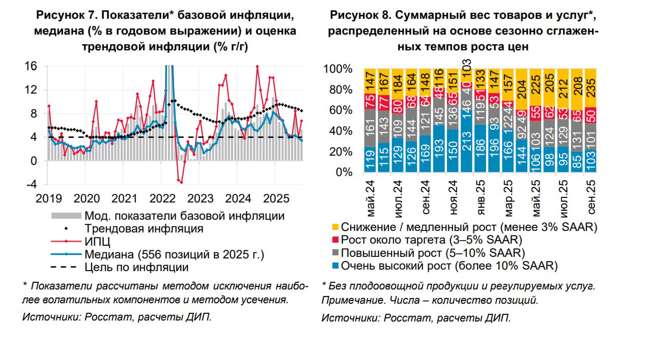 Несмотря на разнонаправленную динамику, общий уровень устойчивого инфляционного давления не изменился, но остается выше целевого уровня в 4%. Дезинфляционные тенденции рассматриваются как постепенные. Вероятнее всего, инфляционное давление, с поправкой на разовые факторы, еще не приблизилось к 4%, хотя и существенно снизилось с конца 2024 года (в документе ЦБ представляет методологию расчета устойчивой инфляции, где нет точного понимания, насколько расчеты являются адекватными).