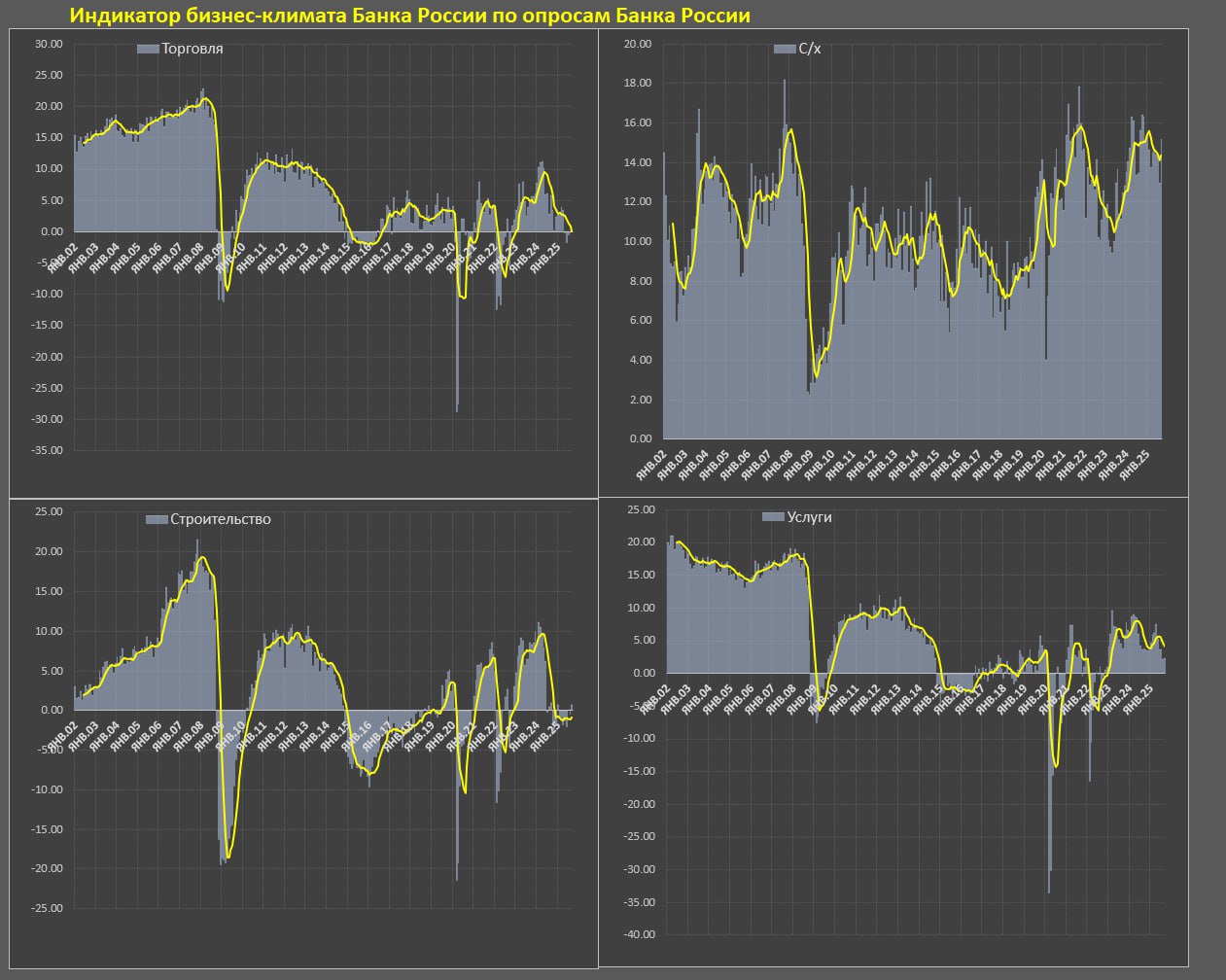 Индикатор бизнес-климата (оценка текущей ситуации и ожидания на краткосрочную перспективу) составил 2.55п в сентябре после 1.24п в августе, за 3м – 1.95п, 6м – 2.45п, 8м25 – 3.26п vs 8.03п за 8м24, в 2024 – 7.12п, 2023 – 7.11п, 2021 – 5.15п и 2017-2019 – 2.89п.