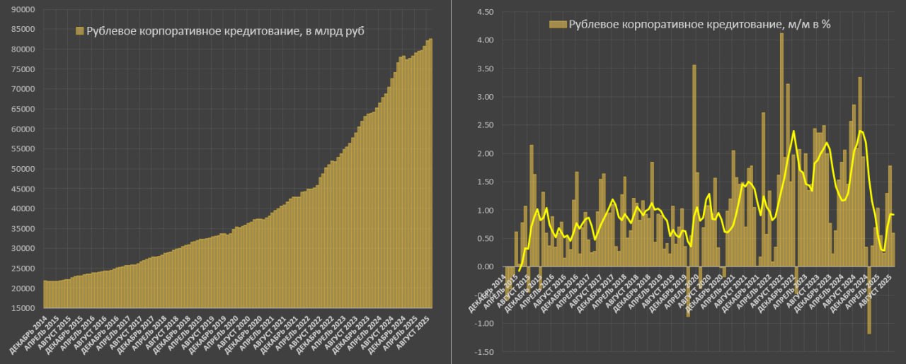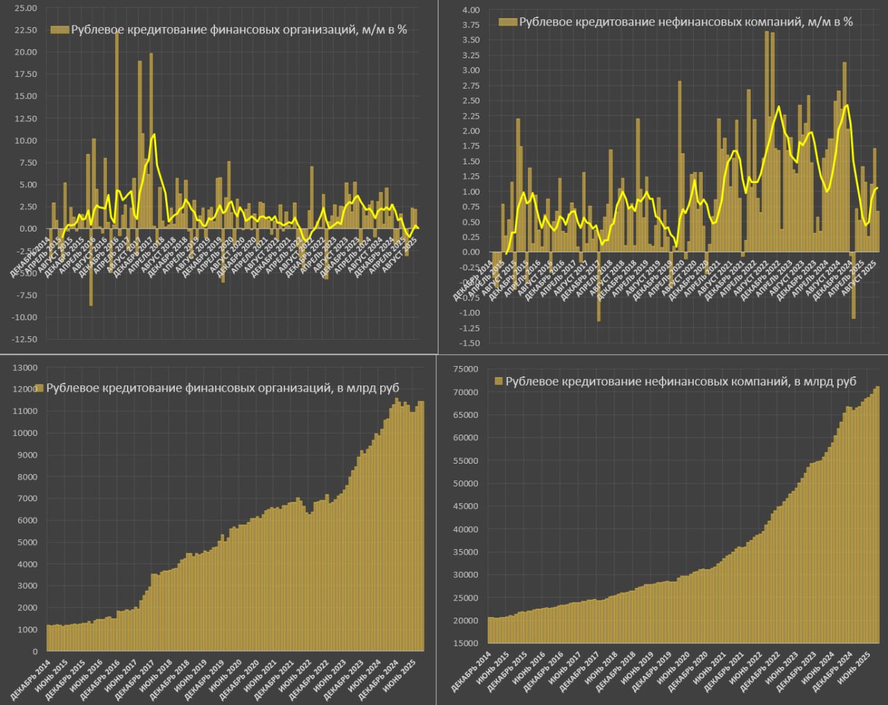 Совокупный объем рублевого кредитования юрлиц (нефинансовые компании + прочие финансовые организации) вырос в сентябре на 0.59% м/м после 1.78% в августе, за 3м – 1.22%, 6м – 0.92%, 9м25 – 0.6% vs 1.7% за 9м24 и 1.69% за 9м23 и 0.82% в 2017-2019 за весь период и 0.79% для выборки за первые 9м по среднемесячным темпам.