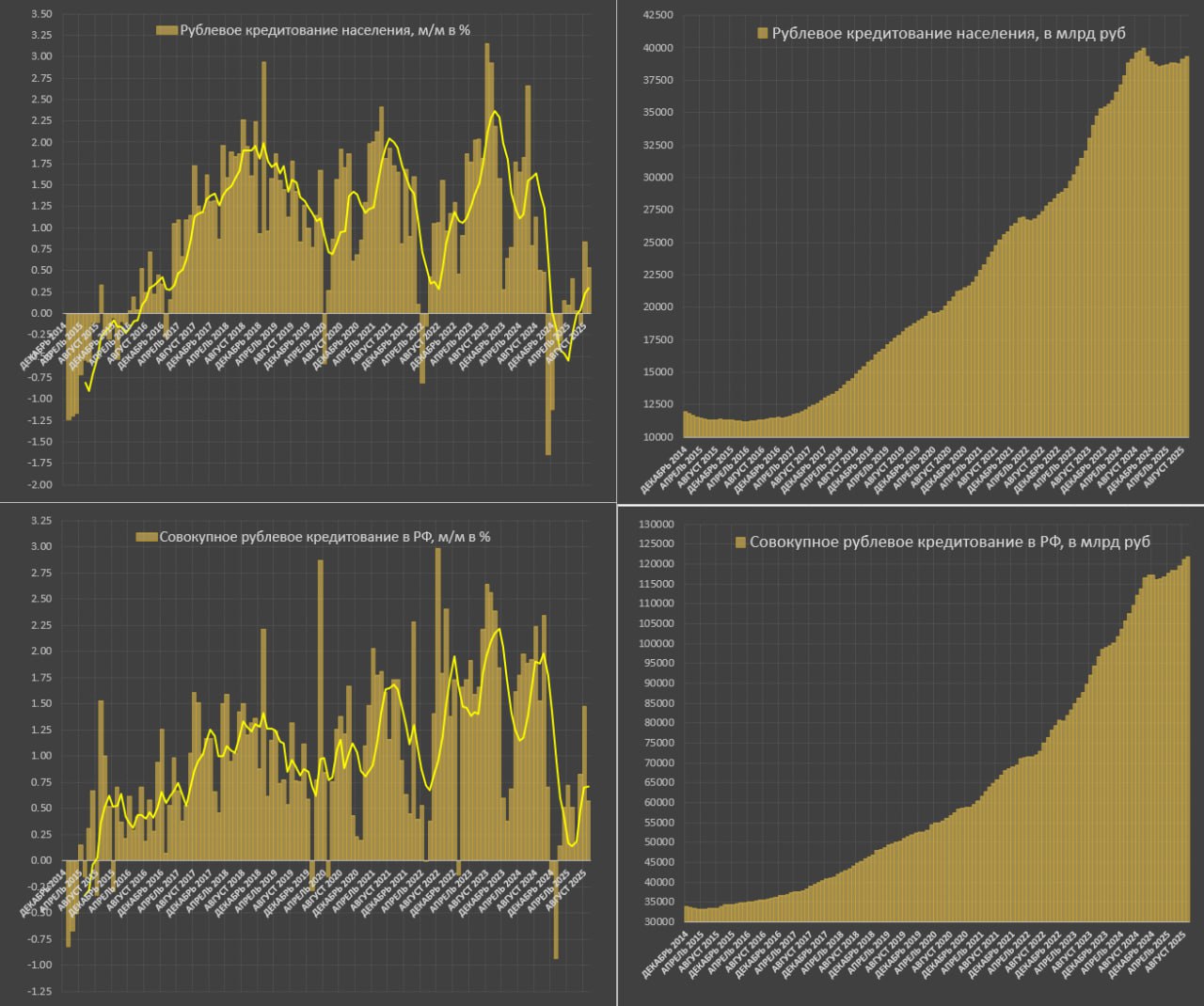В целом, данные показывают умеренную кредитную активность, сформированную целиком и полностью за счет нефинансовых компаний, никакого объявленного ускорения не наблюдается, скорее нормализация низких темпов 1кв25.