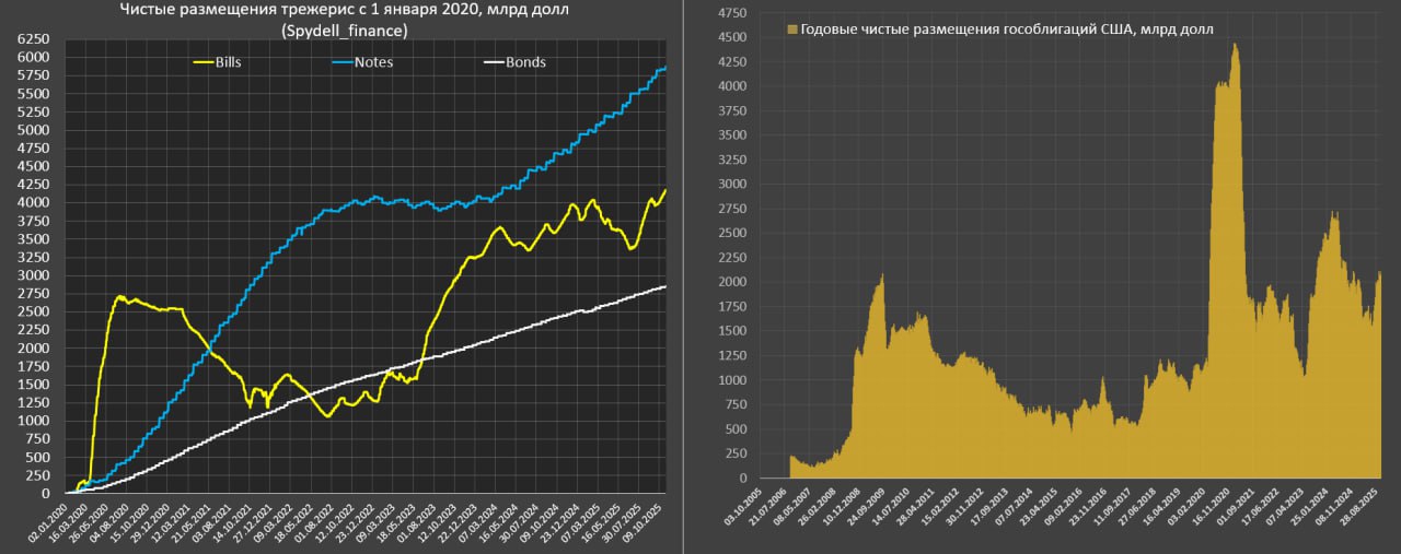 С начала 2025 совокупные чистые размещения – 1.72 трлн (векселя – 406 млрд, ноты – 929 млрд, бонды – 329 млрд, TIPS – 54 млрд).