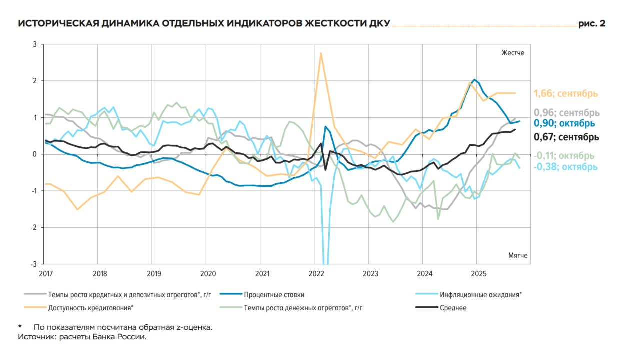 Чтобы не перегружать материал графиками (важных изменений не так много), демонстрирую основной и самый важный график в этом материале – историческая динамика отдельных индикаторов жесткости ДКУ (чем сильнее «отлетают» от нулевого уровня вверх – тем жестче ДКУ и наоборот).