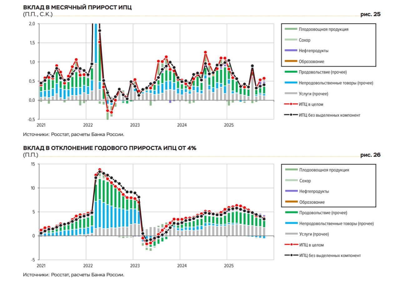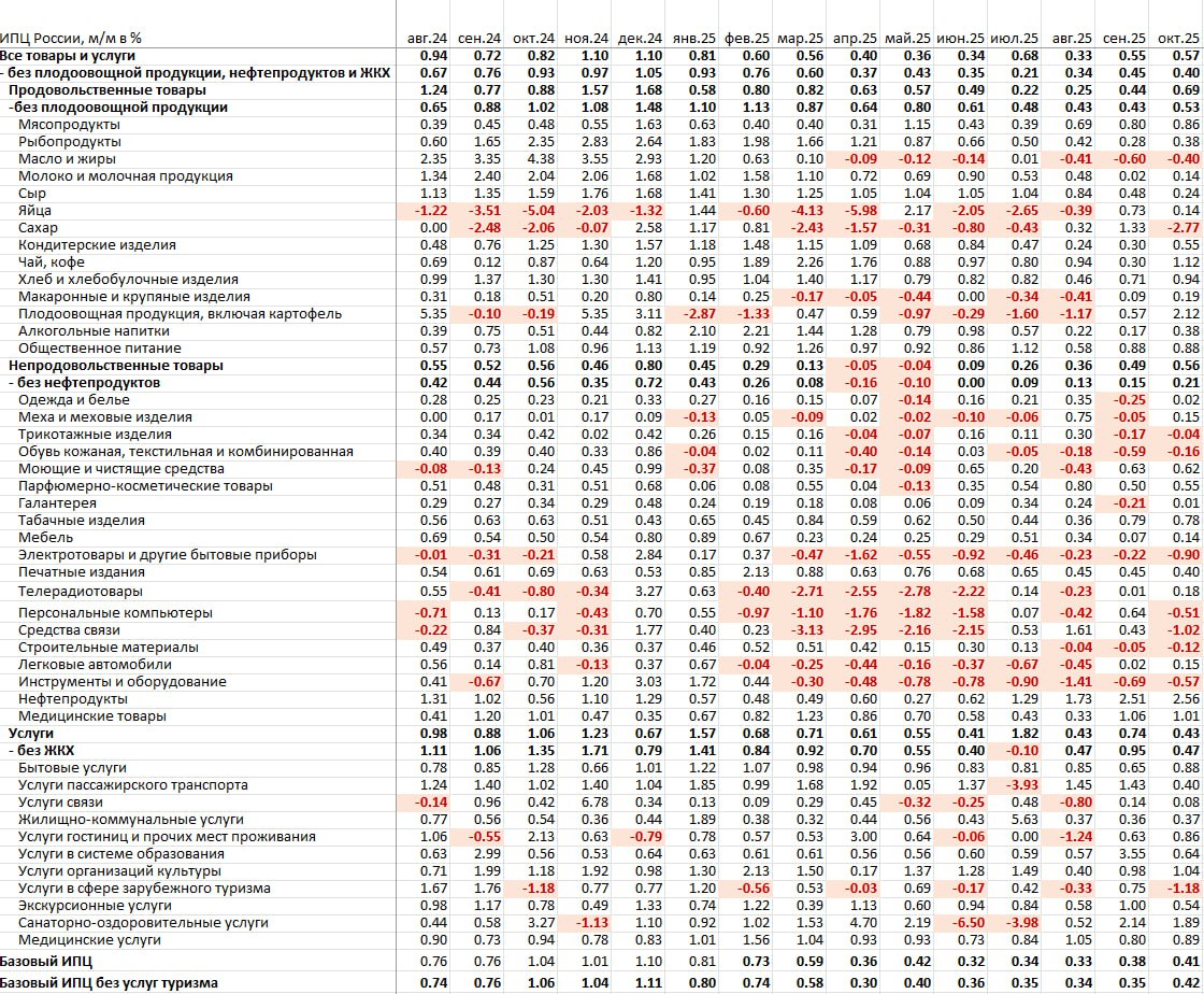 Если исключить самые волатильные категории товаров в этом году (плодоовощная группа, топливо и ЖКХ) – 0.4% в октябре после 0.45% в сентябре, за 3м – 0.4%, 6м – 0.36%, 10м25 – 0.48% vs 0.63% за 10м24 при норме 0.26%.