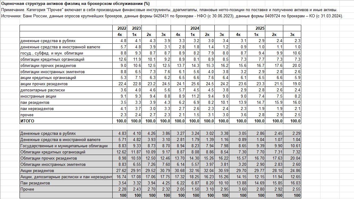 В акциях (с учетом иностранных эмитентов) держат 37.5% от активов vs 43.9% в 4кв24, 48% в 4кв23 и 44.4% в 4кв22.