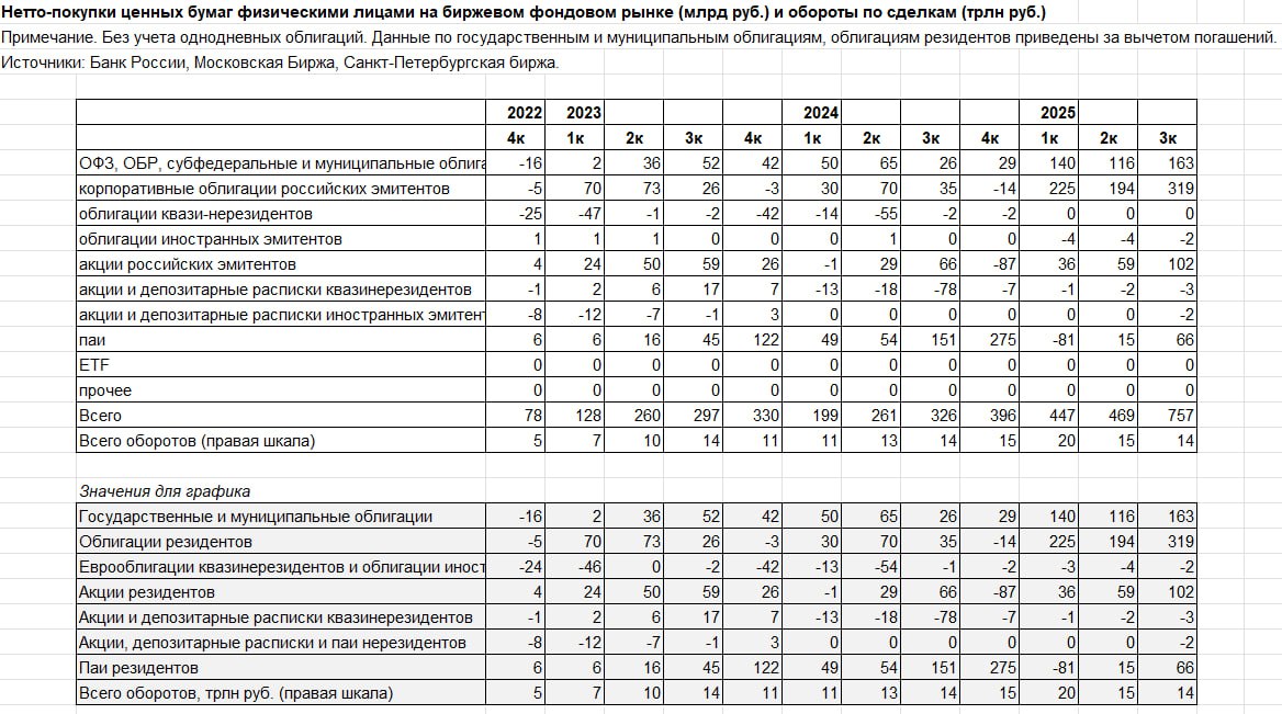 Основной поток идет в облигации: +1148 млрд за 9м25 vs +206 млрд за 9м24 и +210 млрд за 9м23.