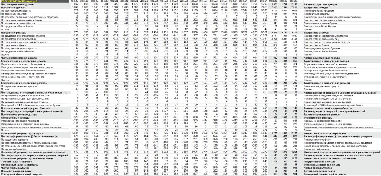 Соответственно, чистые процентные доходы за вычетом резервов по потерям составили 1.24 трлн в 3кв25 (максимум был в 2кв24 – 1.32 трлн), за 9м25 – 2.71 трлн vs 2.45 трлн за 9м24, 1.78 трлн за 9м23 и 1.66 трлн за 9м21.