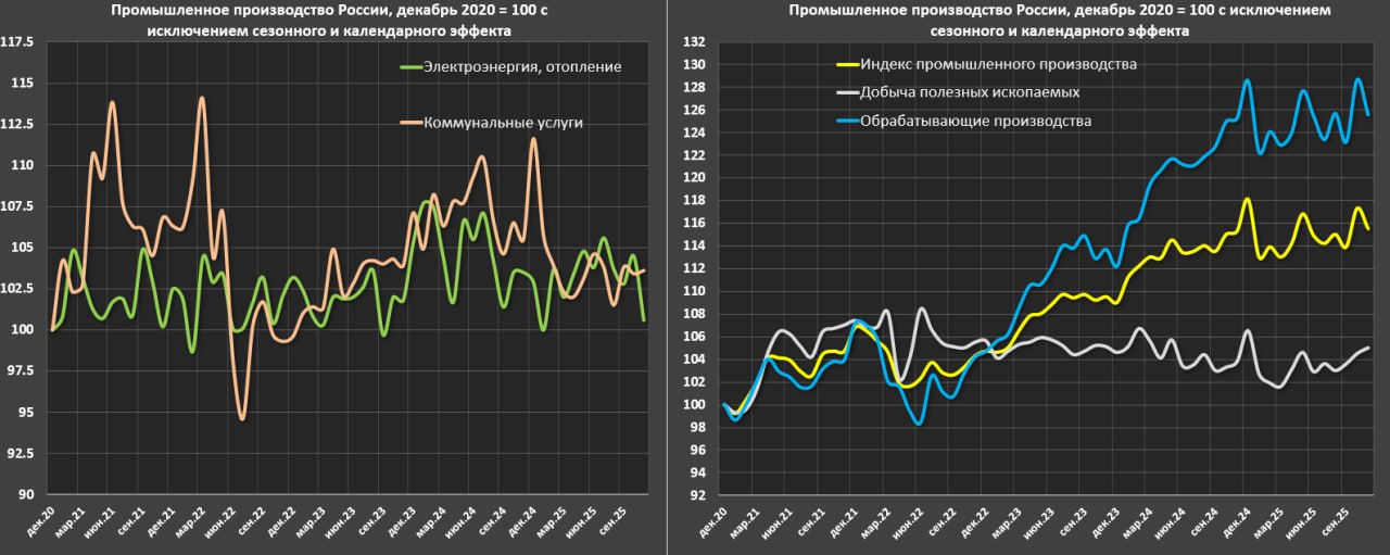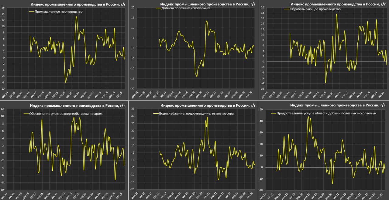 В промышленности негативная тенденция с начала 2025 наблюдается в добыче, электроэнергетике и коммунальных услугах при существенном замедлении роста в обработке (ранее главный стабилизатор промпроизводства).
