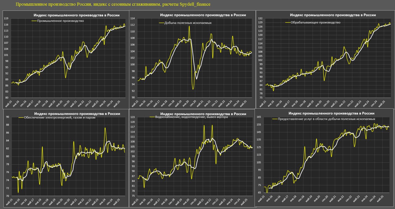 В ноябре добыча выросла на 0.5% м/м SA после +0.9% м/м в октябре. В добыче было практически непрерывное ухудшение и снижение показателей на протяжении трех лет, но с середины 2025 стабилизация и ограниченные попытки роста на низкой базе.