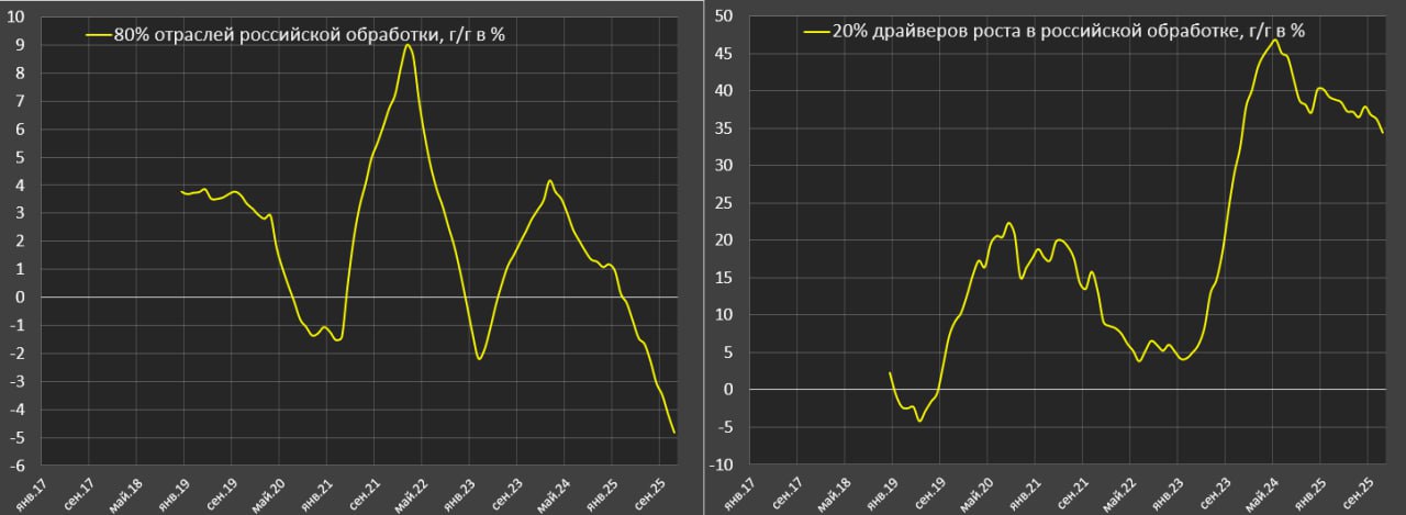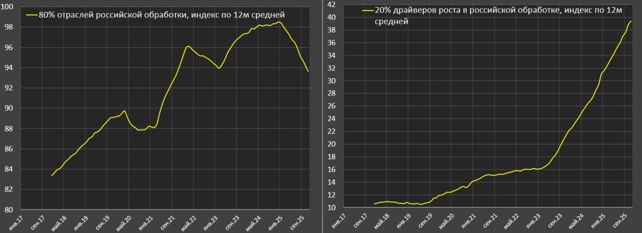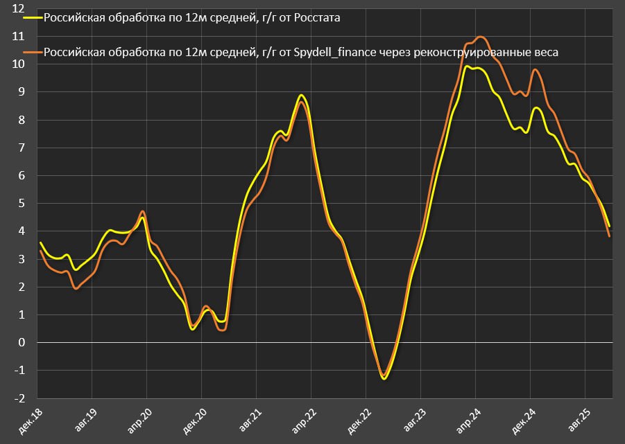 Без полноценных, официальных дефляторов (Росстат их скрывает), синтезированные веса дают приблизительную картину и траекторию. Вероятно, рост драйверов роста около 120-130%, а не 156% с янв.22, а падение всех остальных отраслей не 4.8%, а около 4%, но это не меняет понимание трендов.