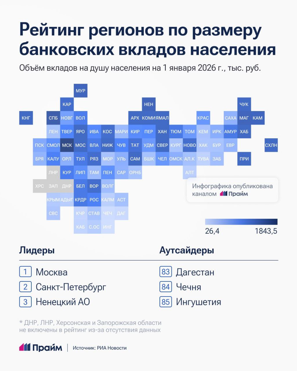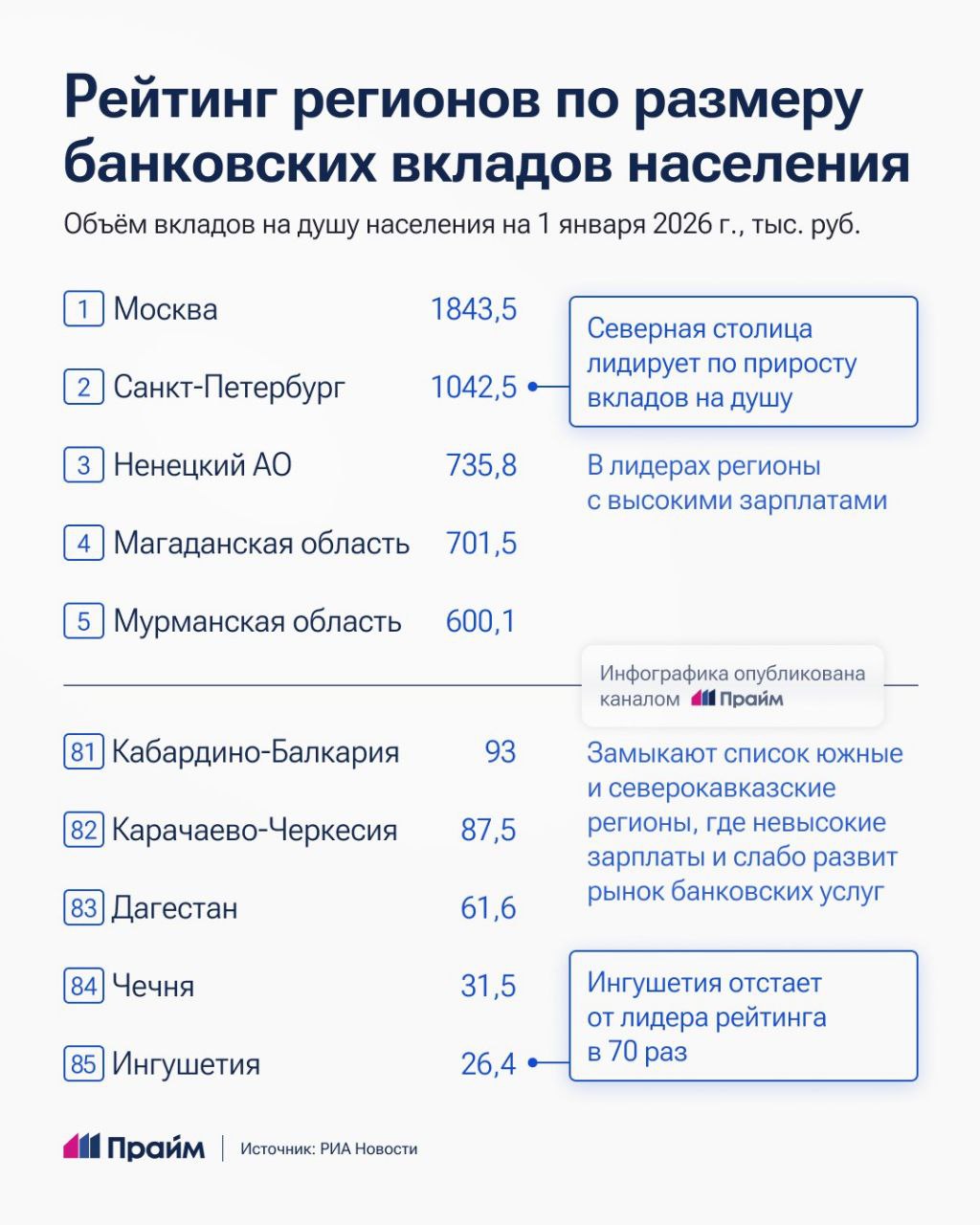 Москва и Санкт-Петербург возглавили рейтинг регионов по объемам вкладов населения, замыкают список Ингушетия и Чечня