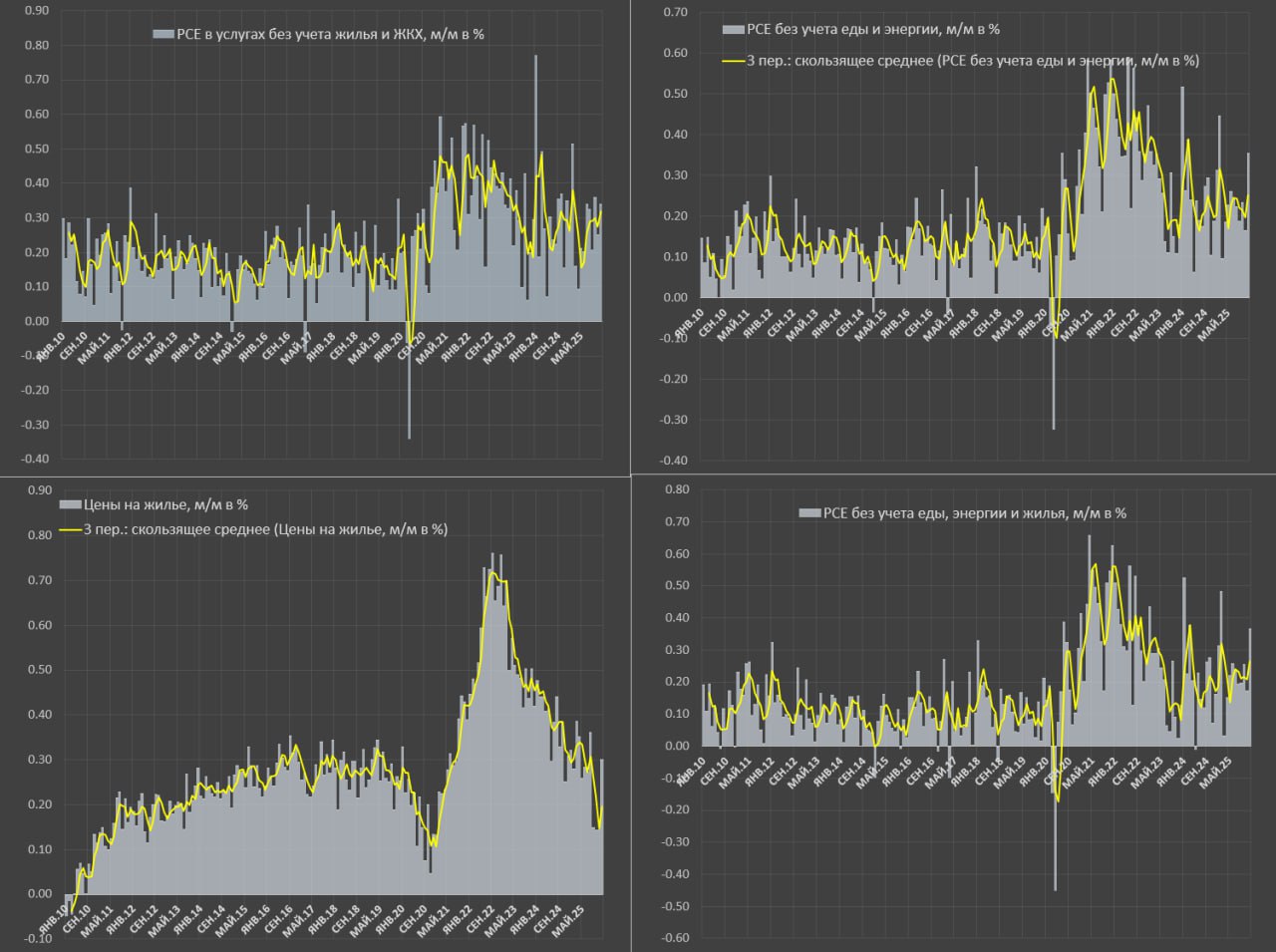 Услуги внесли 0.196 п.п в общий рост цен в 2П25, что на 0.06 п.п выше тренда 2017-2019, где