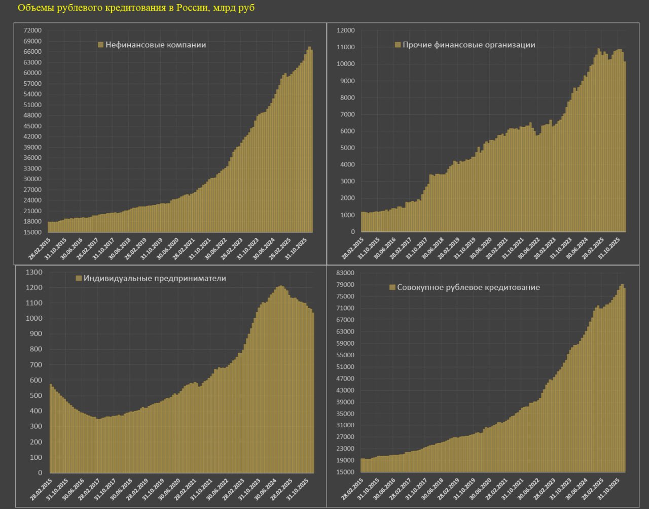 Накопленное снижение с сен.24 составило 14.4% по номиналу! Это сильнейшее сжатие кредитной активности у ИП с 2015-2016. Объем кредитования (1.04 трлн на янв.26) опустился до сен.23.