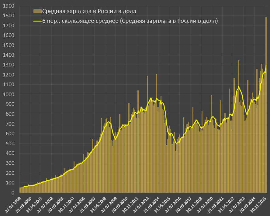 Долларовая зарплата достигла рекордных за всю историю $1782 в дек.25 vs предыдущего рекорда $1344 в дек.22 и $1205 в дек.13. В среднем за год 100.4 тыс руб или $1210.