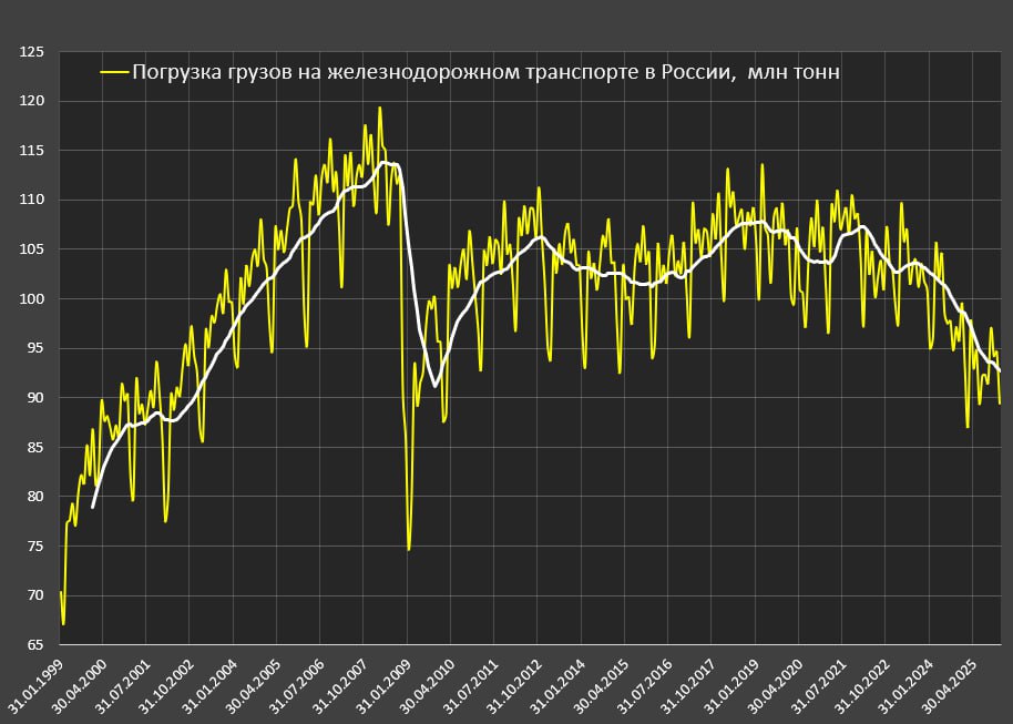 Критически низкий объем погрузки на ЖД в млн тонн: всего 89.4 млн тонн в янв.26 (-4% г/г), что является худшим январем с 2010 года (ранее стабильно грузили по 103 млн тонн за 5 лет с 2018 по 2022).