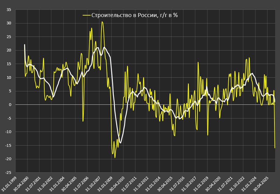 С 2009 не было ни одного раза, когда строительство снижалось более, чем на 12%: худшие эпизоды – авг.15 (-11.8%) г/г и янв.19 (-11%) г/г, даже в 2020 (-4.7% г/г на дне) и 2022 (снижения не было) все было скромнее.
