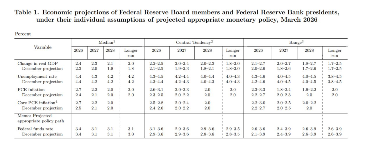 При этом медианный прогноз инфляции (PCE) на 2026 повышен с 2.4 до 2.7%, как и базовая инфляция выросла с 2.5 до 2.7%, но немного улучшен прогноз ВВП с 2.3 до 2.4% при неизменной безработице на уровне 4.4%.