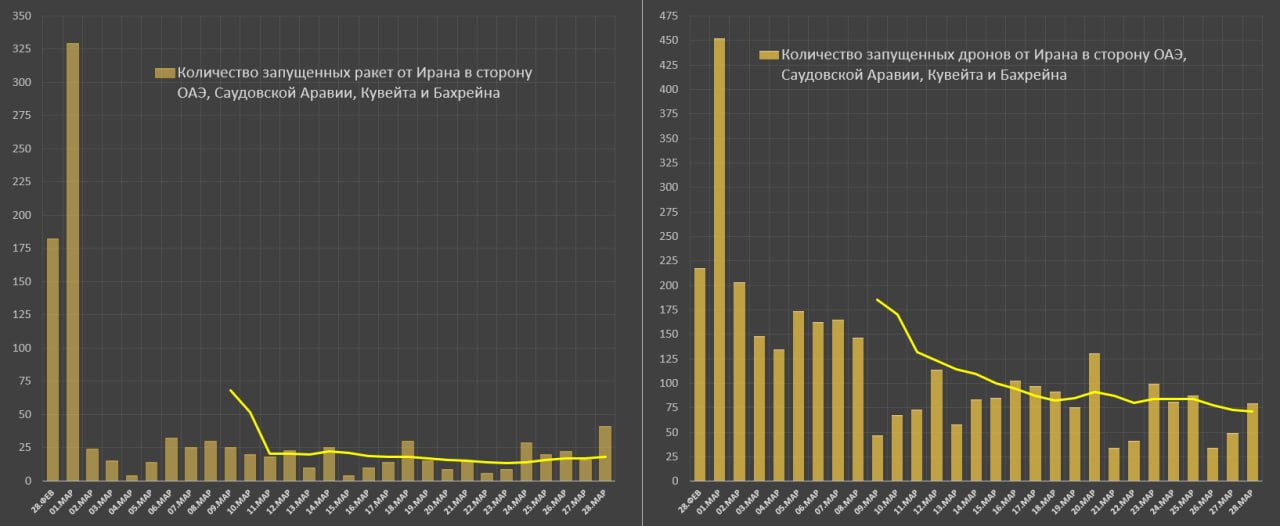 Количество запущенных ракет в сторону Саудовской Аравии, ОАЭ, Кувейта и Бахрейна стабилизировалось на уровне 18.2 ракеты за последние 10 дней про 28 марта включительно (с 2 по 28 марта – в среднем 18.7 ракет).