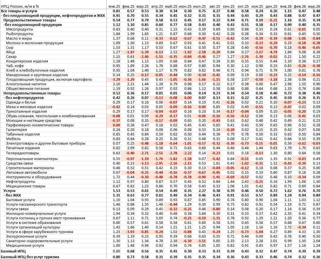 Продукты питания без учета плодоовощной продукции: 0.35% м/м в марте после 0.40% в феврале, за 3м – 0.58%, 6м – 0.44%, 12м – 0.49%, 0.78% в период высокой инфляции, тогда как норма – 0.24%.