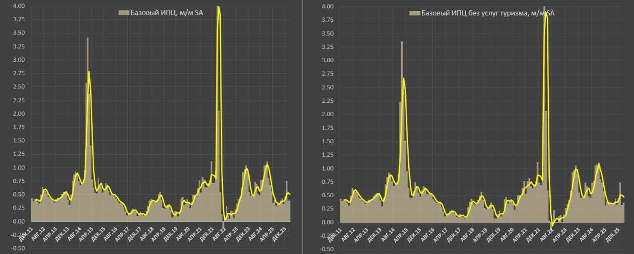 Однако, приглушение инфляционного импульса началось с апреля 2025, так за 8 месяцев (апрель-декабрь 2025) средняя инфляция составила 0.40% и 0.37% без учета волатильных компонентов.
