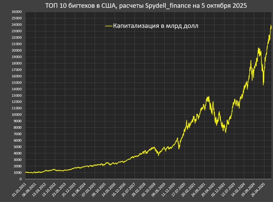 23.7 трлн составляет совокупная капитализация ТОП-10 технологических компаний США (Apple, Nvidia, Microsoft, Google, Amazon, Meta, Tesla, Broadcom, Oracle, Netflix) vs 24 трлн на максимуме 23 сентября по закрытию дня.От минимумов 7-9 апреля по...