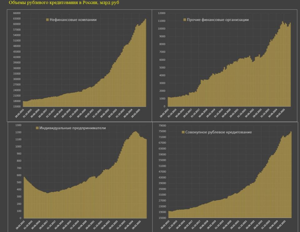В августе совокупное рублевое кредитование юрлиц в России достигло 74.8 трлн и выросло на 1.43% м/м после 1.15% в июле, за 3м – 1.17%, 6м – 0.91%, 8м25 – 0.48% vs 1.62% за 8м24 по сравнению с 1.77% в 2024, 1.9% в 2023, 1.36% в 2021 и 0.75% в 2017-2019...