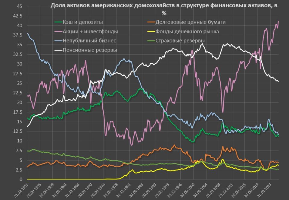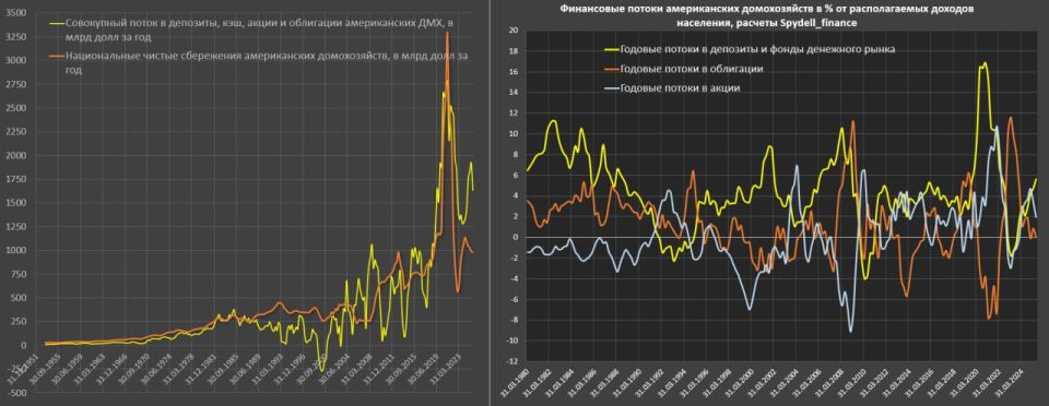 За последний квартал (2кв25 в сравнении с 1кв25) американские домохозяйства распределили 253 млрд по ликвидным финансовым инструментами, среди которых из акций и инвестфондов вывели 29 млрд, в депозиты и наличку ввели 215 млрд, в фонды денежного рынка...