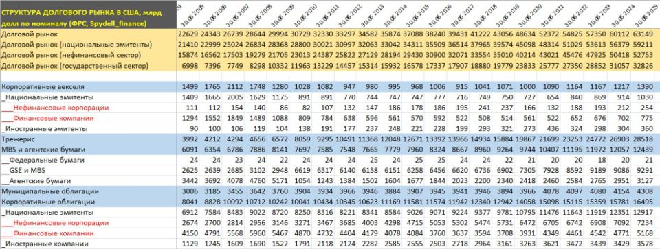 На середину 2025 объем всех долларовых облигаций, обращающихся в системе открытых торгов, составил 63.2 трлн, из которых на национальные эмитенты (резиденты США) приходится 59.2 трлн, нефинансовый сектор оценивается в...