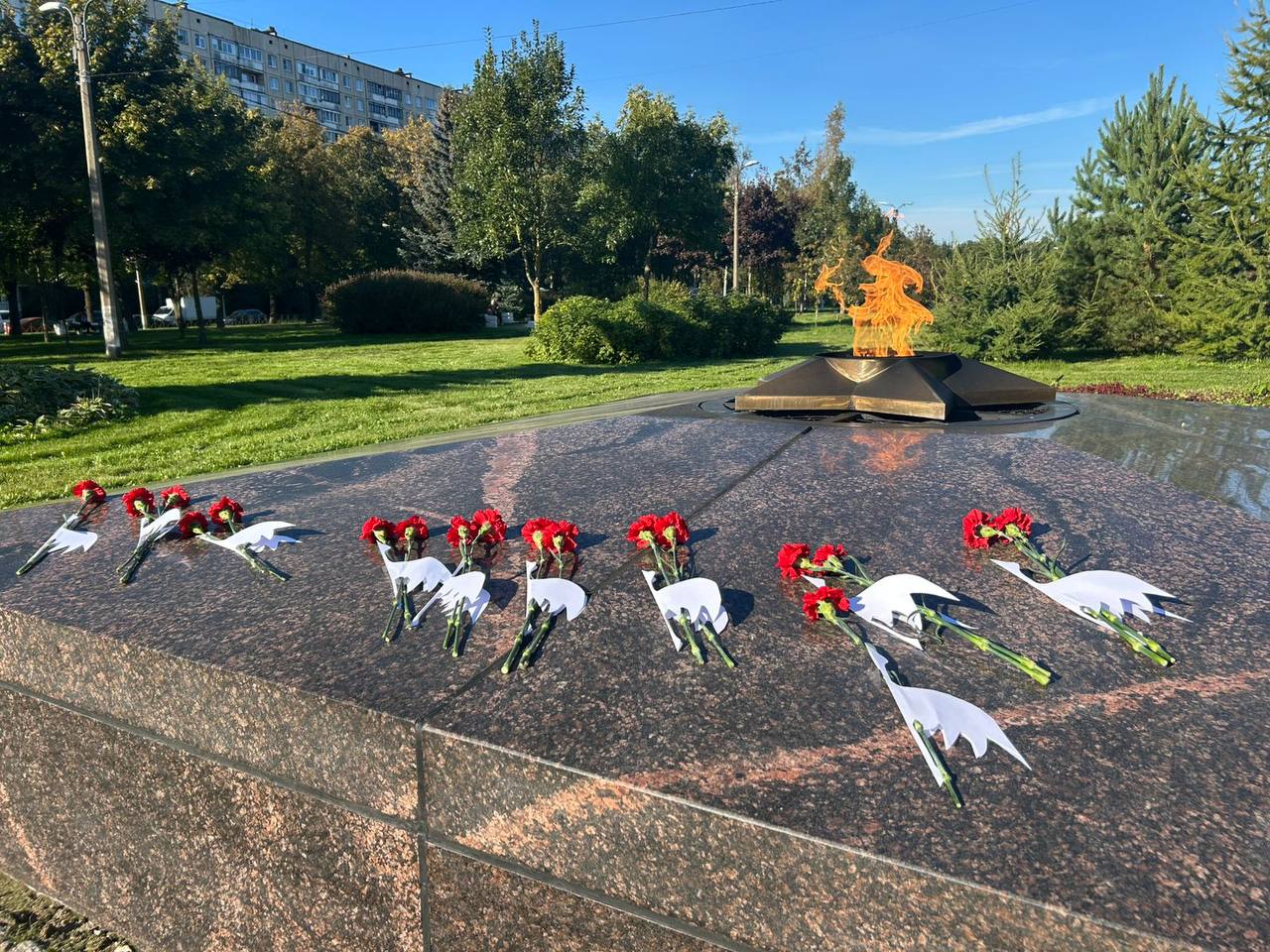 После проведенного турнира участники возложили цветы и бумажных журавлей к стеле "Город воинской славы" в городе Колпино.