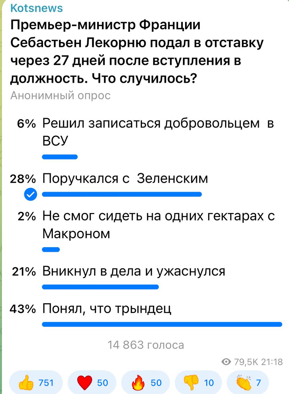 43 процента подписчиков уверены: Лекорню понял, что попал куда-то не туда. Хоть один умный во всем Евросоюзе.