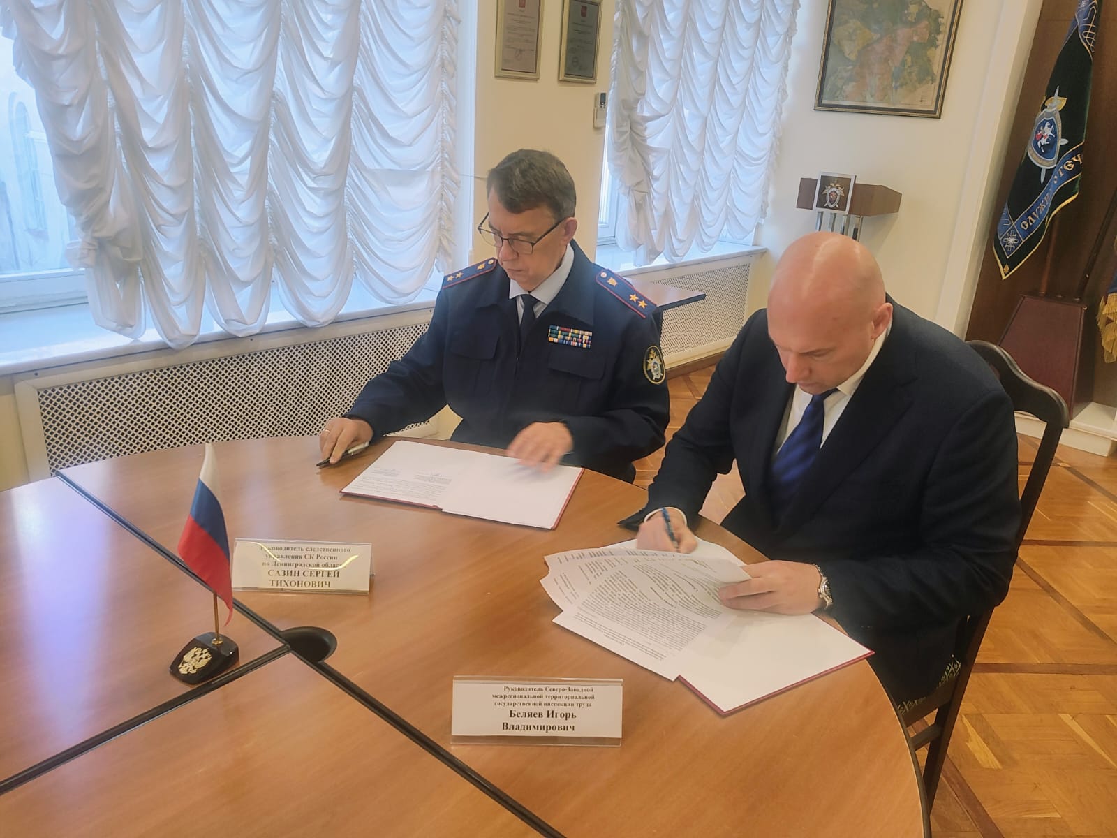 Руководитель следственного управления СК России по Ленинградской области генерал-лейтенант юстиции Сергей Тихонович Сазин и руководитель Северо-Западной межрегиональной территориальной государственной инспекции труда – главный государственный инспектор труда в городе Санкт-Петербурге, Ленинградской, Псковской областях и Республики Карелия Игорь Владимирович Беляев подписали соглашение о сотрудничестве, предметом которого является организация межведомственного взаимодействия в установленных сферах деятельности, в том числе в вопросах предупреждения, выявления, пресечения и расследования преступлений в трудовой сфере, а также в вопросах повышения правовой дисциплины участников трудовых правоотношений.