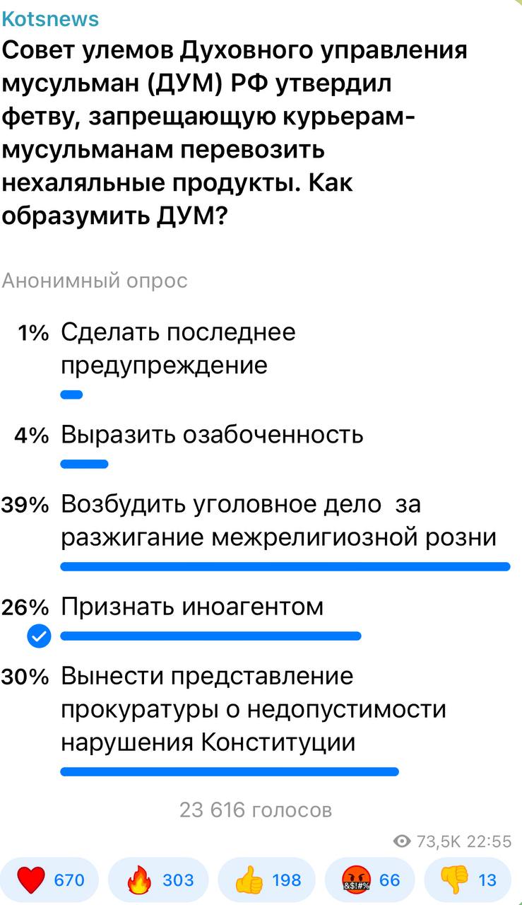 39 процентов подписчиков считают, что ДУМ своими фетвами разжигает в обществе рознь. Во время войны это выглядит как откровенное вредительство.