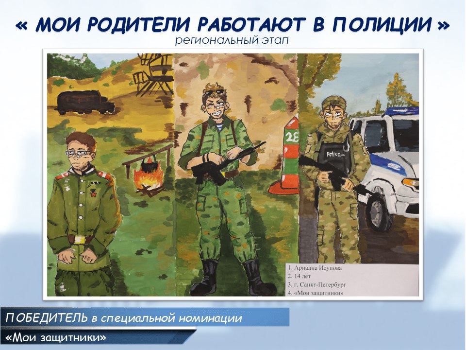 В специальной номинации лучшей работой члены жюри признали рисунок 14-летней Ариадны Исуповой из Фрунзенского района. Ариадна изобразила 3 поколения своей семьи – защитников Отечества.Ее дедушка служил в войсках связи, дядя – в пограничных войсках, а папа является действующим сотрудником МВД, ветераном боевых действий.