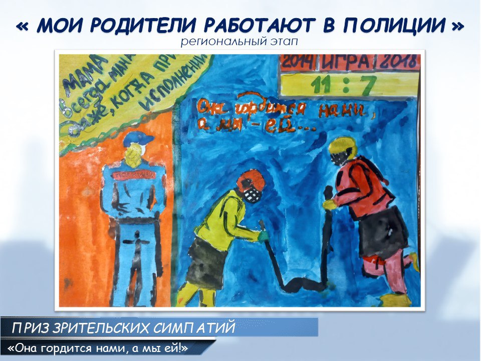 Вместе с тем, члены жюри приняли решение дополнительно отметить рисунок «Она гордится нами, а мы ей», подготовленный братьями Елисеем и Вениамином Емельяновыми, 11 и 6 лет. Мальчики профессионально занимаются хоккеем и в своем рисунки совместили любимое увлечение и мамину службу, написав «Мама всегда мама, даже когда при исполнении».