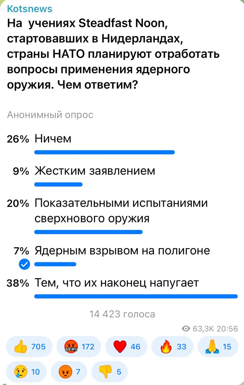 38 процентов подписчиков считают, что пугать Запад надо тем, что их напугает. Давненько мы Царь-Бомбу на Новой Земле не подрывали.