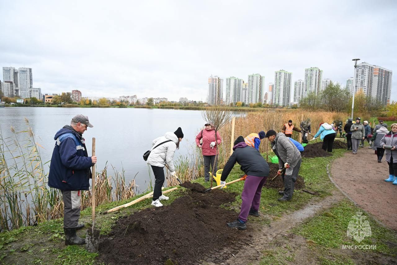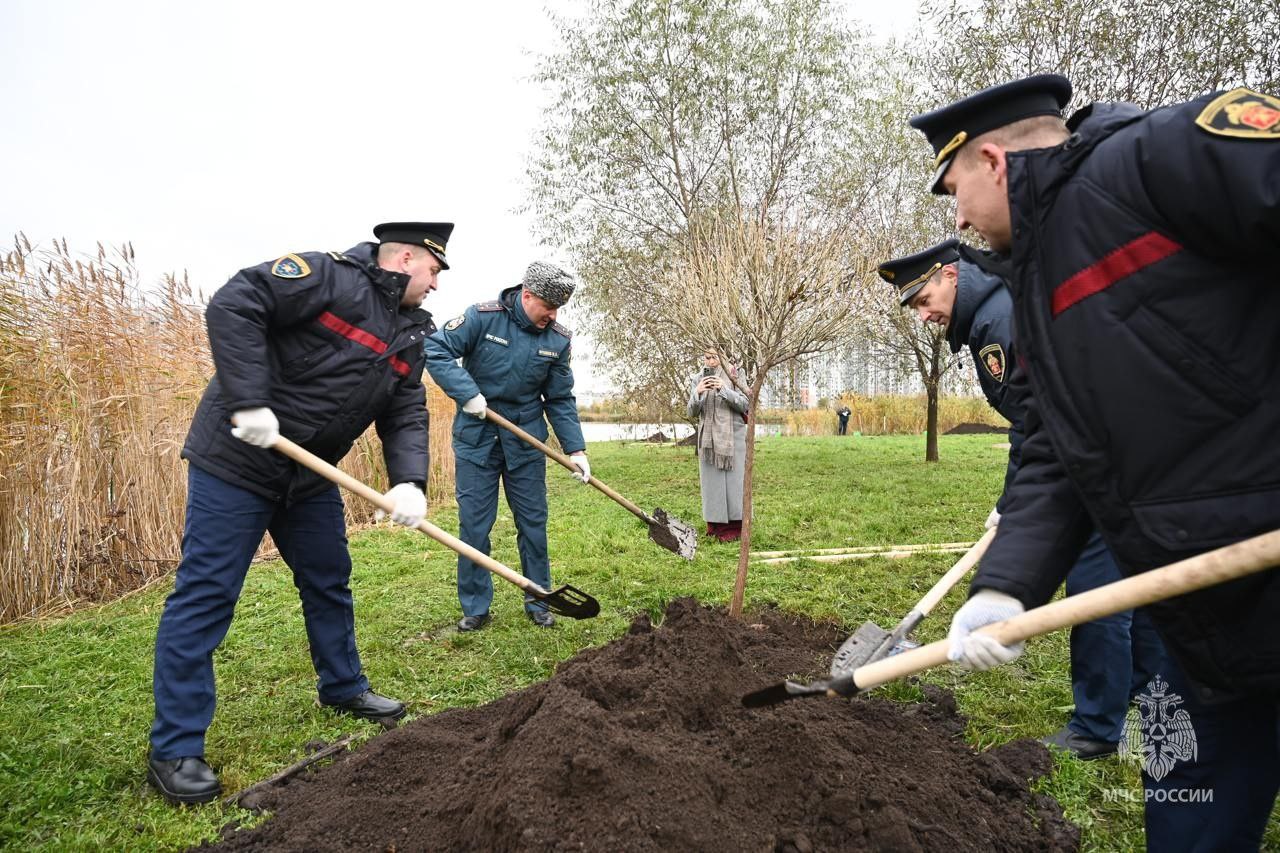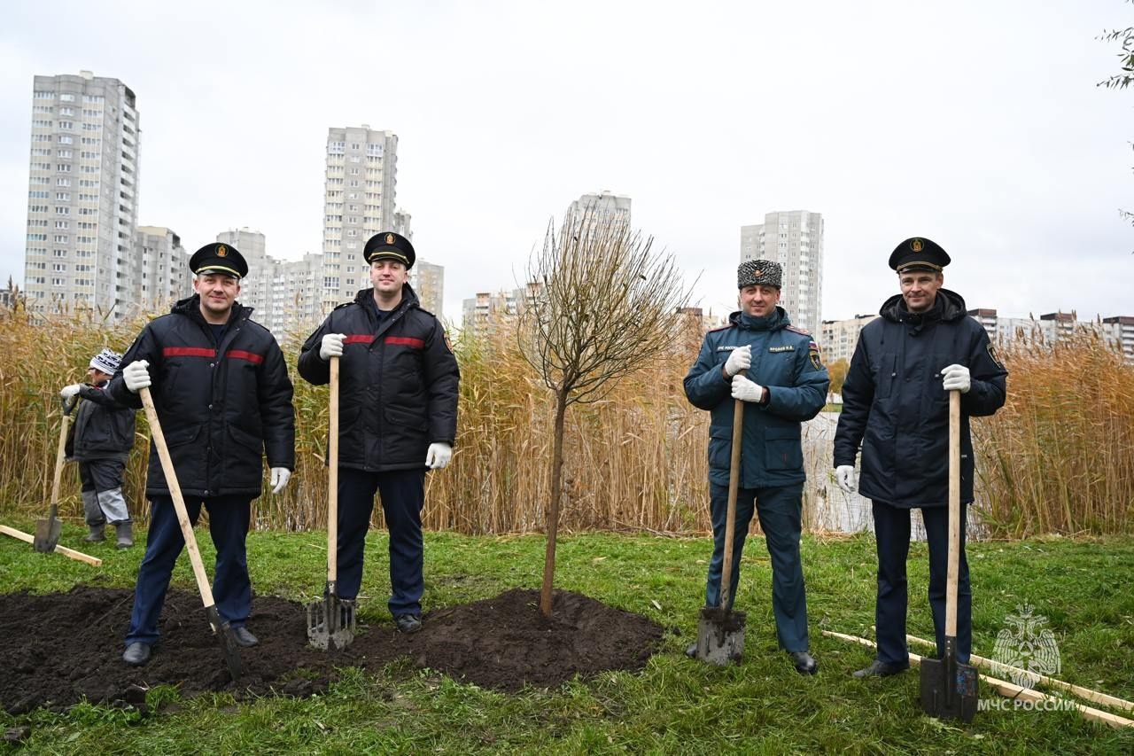 В год 35-летия МЧС России пс высадили саженцы шаровидных ив в Парке Героев-пожарных