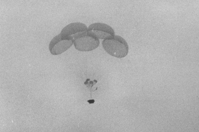 Взбодрились - и пошли на взлет. Первыми в мире. На высоте 800 метров машина была сброшена из грузового отсека Ан-12Б.