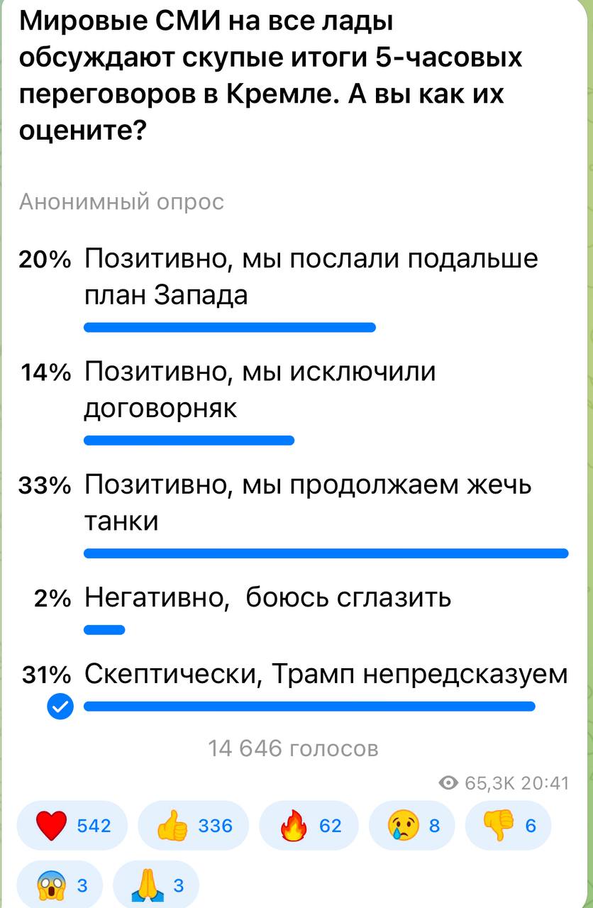 33 процента подписчиков оценивают результаты переговоров позитивно. Договорнячка не будет, продолжаем воевать.