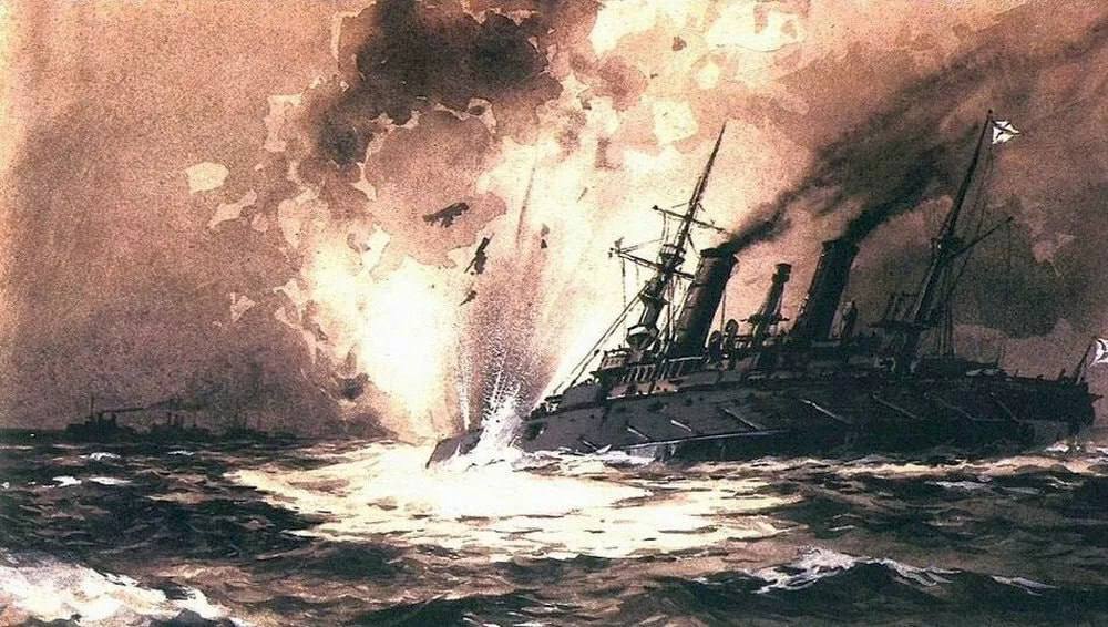 В 09.39 флагманский эскадренный броненосец «Петропавловск» подорвался на внешнем рейде на мине (или связке мин). От взрыва детонировали пороховые и минные погреба, и судно в две минуты ушло под воду.