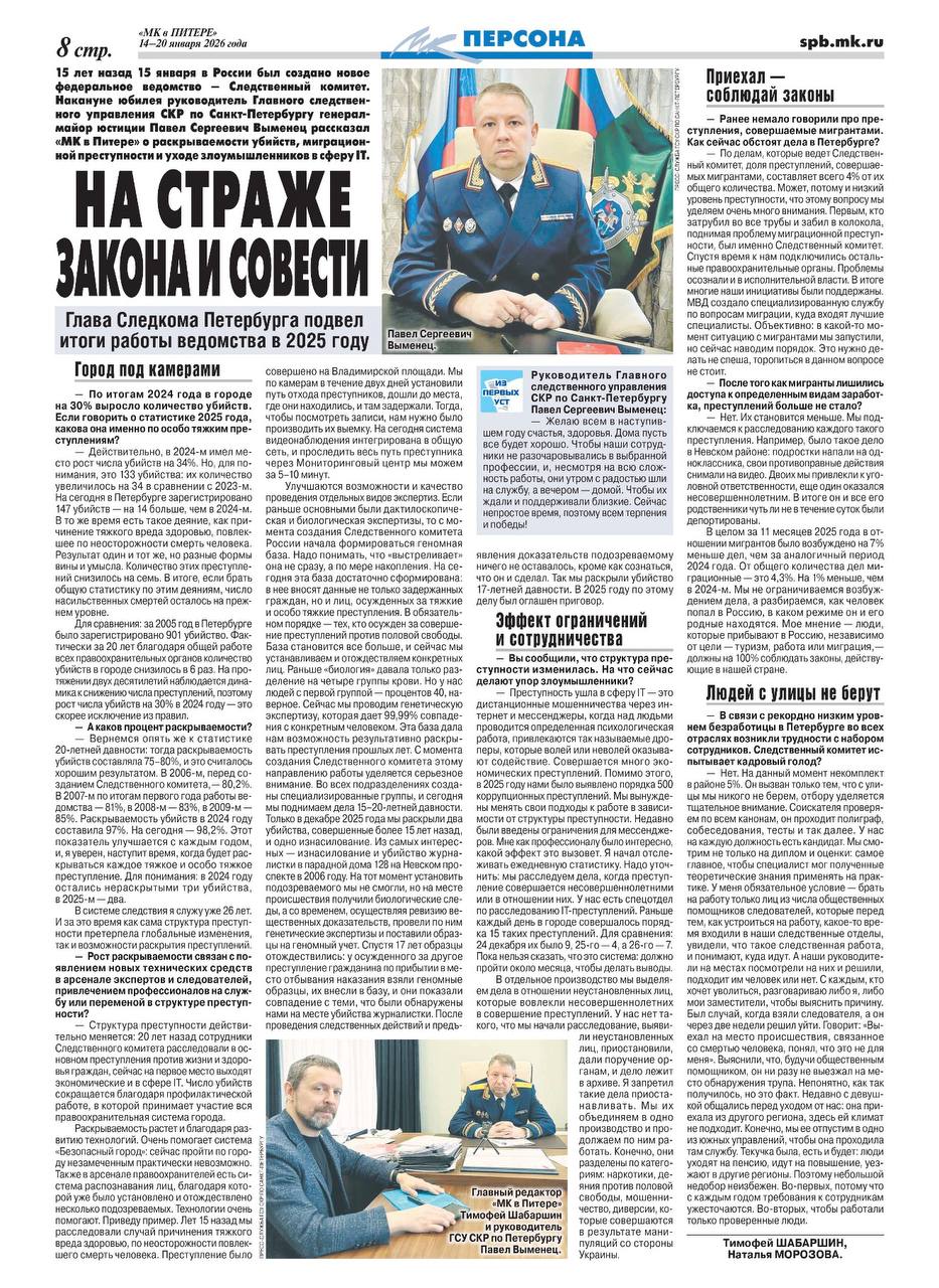 В преддверии 15-летия СК России руководитель Главного следственного управления СК России по городу Санкт-Петербургу генерал-майор юстиции Павел Сергеевич Выменец дал интервью изданию «МК в Питере». Он рассказал о раскрываемости убийств, миграционной преступности, уходе злоумышленников в сферу IT и многом другом.