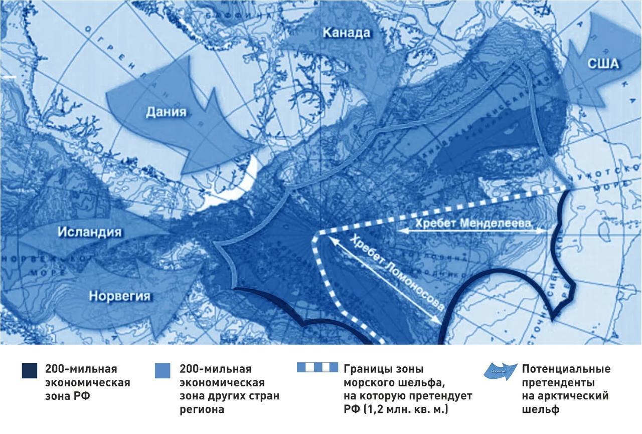 На сегодняшний день на львиную долю арктического пирога (до 47 процентов нефти и до 70 процентов газа) рассчитывает Россия. Мы претендуем на так называемый хребет Гаккеля - большую часть подводного арктического шельфа площадью более миллиона квадратных километров, являющегося продолжением континентальной плиты, на которой стоит наша страна. Со всеми скрытыми подо льдом богатствами.