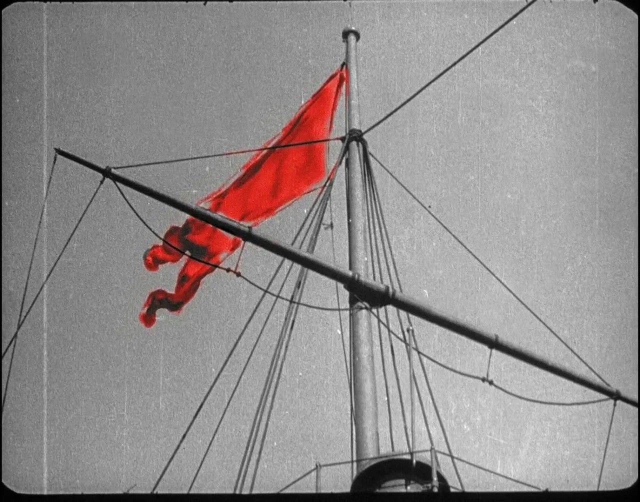 Момент, когда над броненосцем взвивается красный флаг мятежа, произвел впечатление разорвавшейся бомбы: в черно-белом кадре возникло цветовое пятно - каждый из 108 кадриков с флагом художники раскрасили вручную кисточкой.