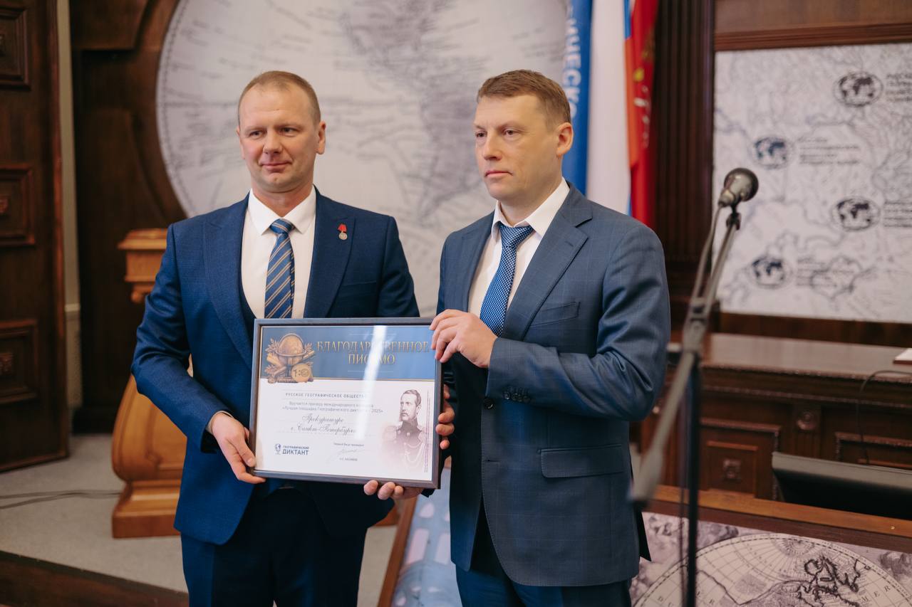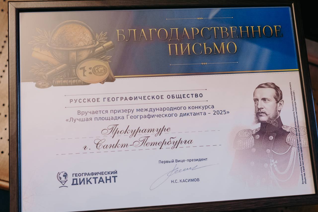 В рамках мероприятия директор Штаб-квартиры Роман Рябинцев также вручил прокурору города Виктору Мельнику благодарственное письмо Русского географического общества. Прокуратура г. Санкт-Петербурга отмечена как один из призеров международного конкурса Лучшая площадка проведения Географического диктанта 2025, участниками которого стали более 10 тыс. площадок по всему миру.