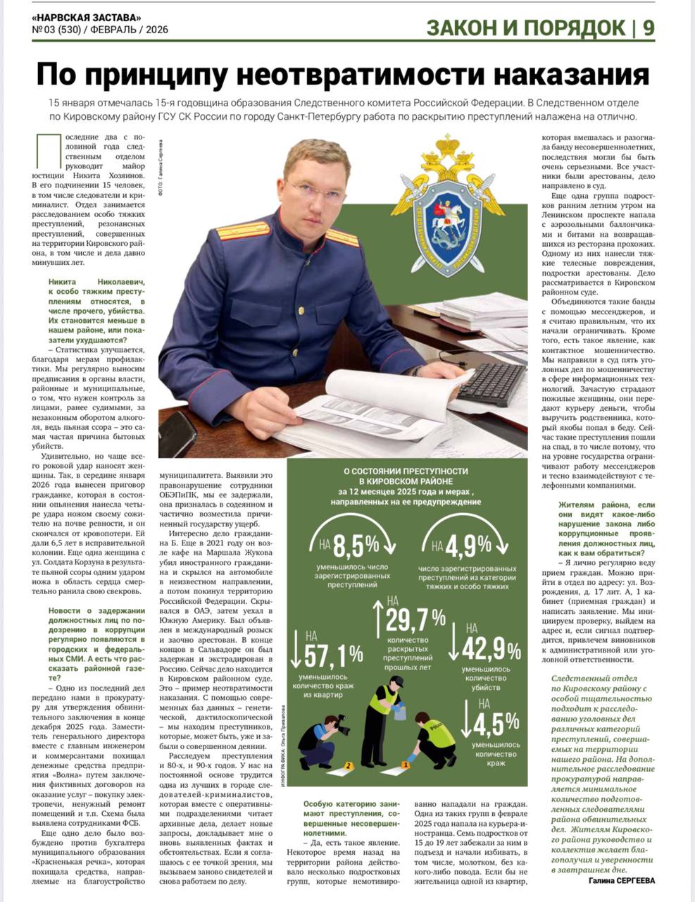 Руководитель следственного отдела по Кировскому району ГСУ СК России по городу Санкт-Петербургу Никита Николаевич Хозяинов в интервью газете «Нарвская застава» рассказал об итогах работы отдела и резонансных уголовных делах.