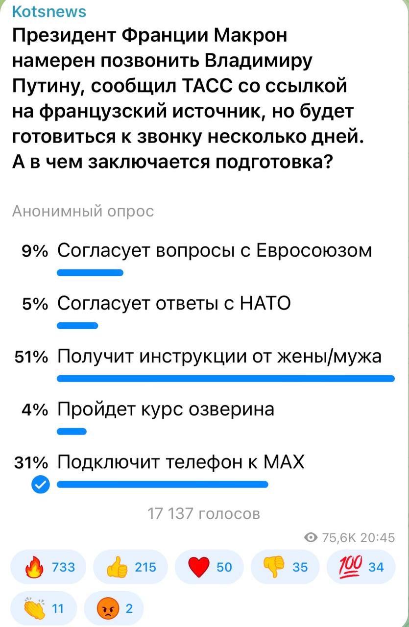 51 процент подписчиков считают, что Макрон ждет инструкции от своего супруга/супруги. Натурально, подкаблучник (подботиночник? подсапожник?)